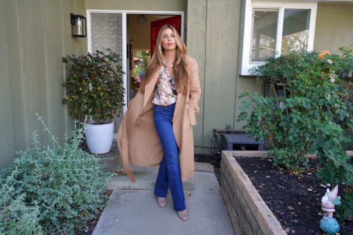 Neutral tones may be timeless, but this year’s selections add subtle personality. I fell in love with a silky olive L’Agence blouse (wearing a size large), detailed with delicate chain accents. Paired with high-waisted bootcut jeans from the same brand (size 26) and a camel wool coat by Reiss (size 6), the outfit balances polish with ease.